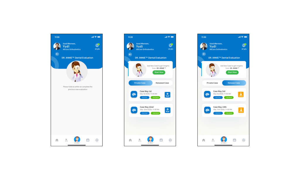 - DR. ANNIE™ Card – Includes a “Start Now” button to begin a new dental evaluation session.
